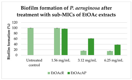 The EtOAcR inhibited P. aeruginosa biofilm formation by 83.8 ± 0.03% and 84.9 ± 0.05% at concentrations of 3.12 mg/mL and 6.25 mg/mL, respectively. The same concentrations of EtOAcAP extract inhibited biofilm formation by 38.7 ± 0.04% and 61.5 ± 0.02%, respectively.