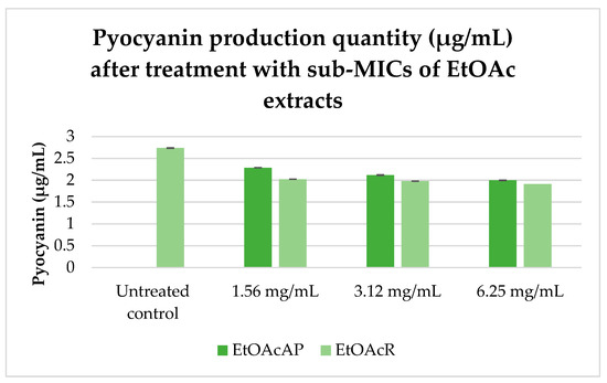 Pyocyanin production quantity of P. aeruginosa untreated and treated with EtOAcAP and EtOAcR from G. urbanum.