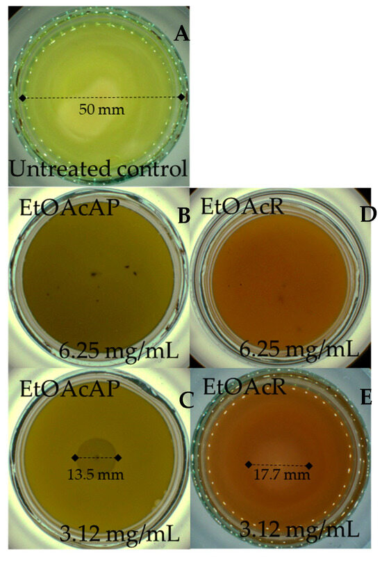 Swarming motility capacity of P. aeruginosa untreated and treated with EtOAcAP and EtOAcR from G. urbanum. Legend: (A) untreated control, (B) treated bacterial culture with 6.25 mg/mL of EtOAcAP extract, (C) treated bacterial culture with 3.12 mg/mL of EtOAcAP extract, (D) treated bacterial culture with 6.25 mg/mL of EtOAcR extract, and (E) treated bacterial culture with 3.12 mg/mL of EtOAcR extract.