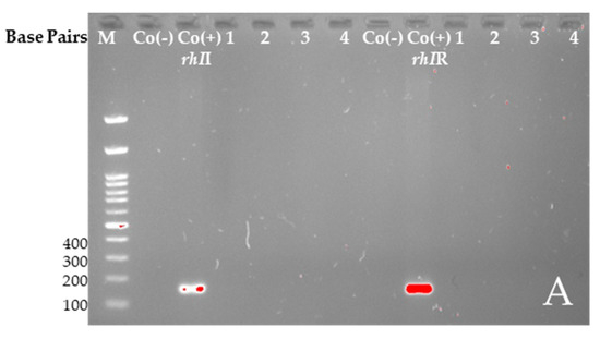 Las/RhI regulatory system gene expression by PCR from biofilm-forming and pyocyanin production probes. (A) rhII and rhIR genes (M—marker; Co(−)—negative control; Co(+)—positive control. (1) EtOAcAP 6.25 mg/mL, (2) EtOAcAP 3.12 mg/mL, (3) EtOAcR 6.25 mg/mL, and (4) EtOAc 3.12 mg/mL). (B) lasI and lasR genes (M—marker; Co(−)—negative control; Co(+)—positive control. (1) EtOAcAP 6.25 mg/mL, (2) EtOAcAP 3.12 mg/mL, (3) EtOAcR 6.25 mg/mL, and (4) EtOAc 3.12 mg/mL).