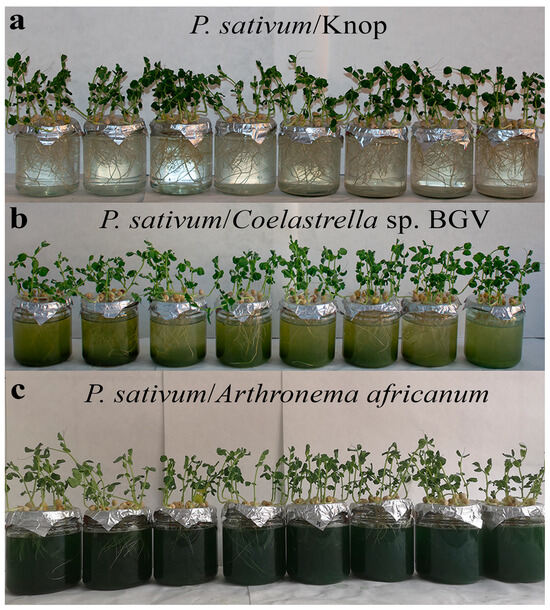 Experimental co-cultivation systems under ZnSO4 treatment on day 3. (a) P. sativum in control Knop medium. (b) P. sativum with Coelastrella sp. BGV. (c) P. sativum with Arthronema africanum.