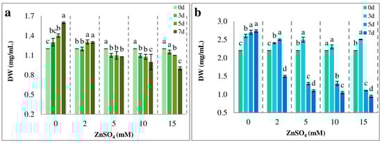 Effect of Zn treatment on microalgal growth. Samples were analyzed at 0, 3, 5, and 7 days (d). The data are represented as mean ± SE. Different letters indicate statistically significant differences in dry weight (DW) for each treatment at p < 0.05. (a) Coelastrella sp. BGV. (b) Arthronema africanum.