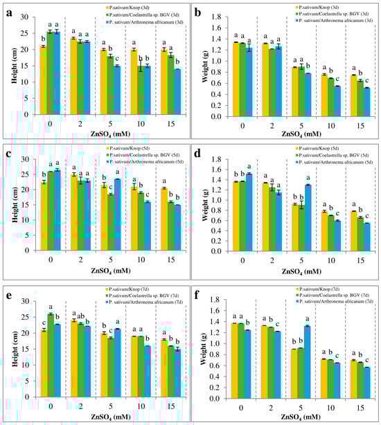 Effect of Zn treatment on P. sativum morphometric indicators. The three experimental systems with pea plants were subjected to a series of concentrations of ZnSO4 for seven days. The data are represented as mean ± SE. Different letters indicate statistically significant differences between experimental systems for each treatment at p < 0.05. (a,c,e) Plant height at days 3, 5, 7. (b,d,f) Biomass (fresh weight) at days 3, 5, 7.