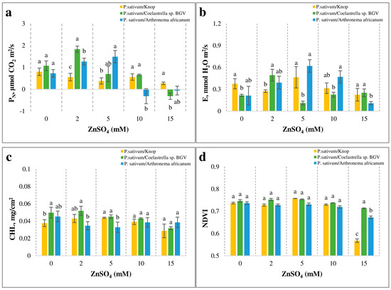 Effect of Zn treatment on physiological indicators in P. sativum leaves. The three experimental systems with pea plants were subjected to a series of concentrations of ZnSO4 for five days. The data are represented as mean ± SE. Different letters indicate statistically significant differences between experimental systems for each treatment at p < 0.05. (a) Net photosynthetic rate (PN). (b) Transpiration rate (E). (c) Chlorophyll (CHL) content. (d) Normalized difference vegetation index (NDVI).