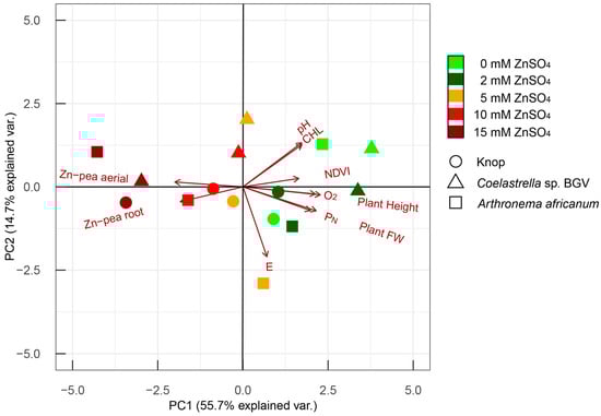 The length and orientation of a parameter vector in the PC1/PC2 coordinate system reflect the contribution level of the respective parameter to the components: the longer the vector and the higher its proximity to an axis, the greater its contribution to the respective PC. All the parameters but E, pH, and CHL primarily determine PC1, while E – PC2, and pH and CHL, influence both equally. Differences between the individual experimental systems with increasing ZnSO4 concentrations are strong and reflected along PC1—its negative values are associated with higher Zn content. The PCA clearly demonstrates that high Zn levels lead to P. sativum growth retardation and accumulation of the metal in the root and above-ground part. The Zn protective effect of microalgae co-cultivation was observed for all ZnSO4 treatments for Coelastrella sp. BGV and up to 5 mM for Arthronema africanum.