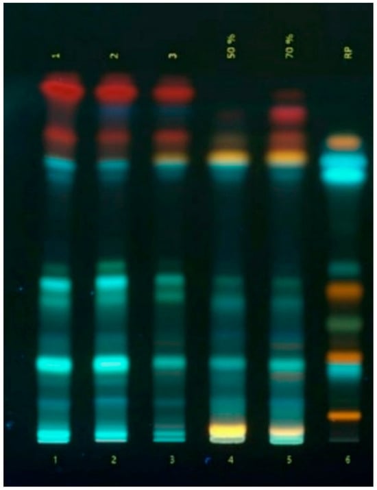 TLC chromatogram of phenolic compounds in Ajuga reptans L. herb extracts: 1–3—extracts of A. reptans; 4—A. reptans extract (extraction agent: 50% ethanol); 5—A. reptans extract (extraction agent: 70% ethanol); 6—comparison solution (rutin (Rf = 0.05), apigenin-7-glucoside (Rf = 0.07), chlorogenic acid (Rf = 0.22), isoquercitrin (Rf = 0.24), hyperoside (Rf = 0.26), apigenin (Rf = 0.35), luteolin (Rf = 0.42), caffeic acid (Rf = 0.45), ferulic acid (Rf = 0.77), quercetin (Rf = 0.79)).