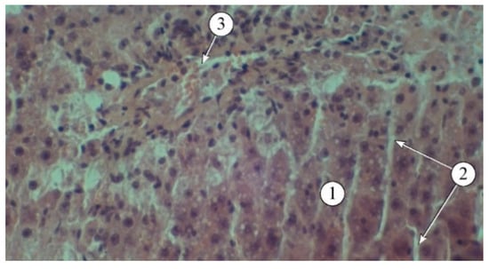 Structural features of liver lobules in animals that received the “Silibor” preparation. 1—hepatic plates, 2—sinusoid, 3—central vein. Staining: hematoxylin and eosin. Magnification: ×200.