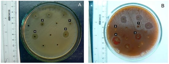 Antimicrobial activity of Ajuga reptans L. herb extracts prepared using AR1 (extraction agent: purified water) (1), AR2 (extraction agent: 50% ethanol) (2), AR3 (extraction agent: 70% ethanol) (3), and gentamicin (4) against cultures of Enterococcus faecalis (A) and β-hemolytic Streptococcus group G (B).