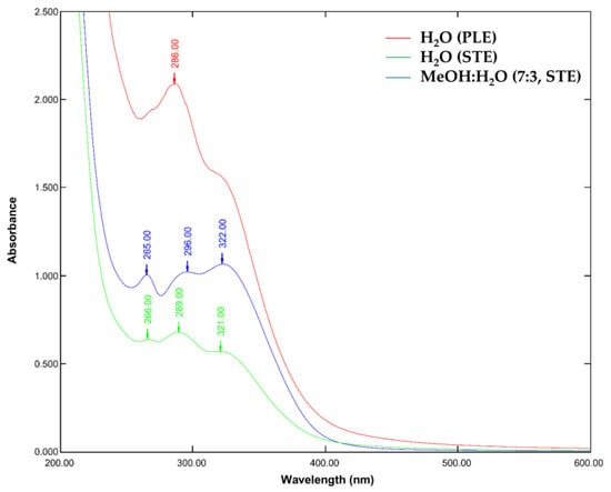 UV-vis absorption spectra of the Helichrysum amorginum (HA) diluted extracts H2O (PLE), H2O (STE), and MeOH:H2O (7:3, STE).