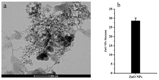To ascertain whether the ZnO NPs used in this experiment meet the requirements for nanomaterials, the morphology and characterization of ZnO NPs were observed. TEM observation results were found to show that the ZnO NPs particles are approximately elliptical or spherical in shape (Figure 1a), distributed mainly in aggregated forms, and that the average particle size was 20–30 nm (Figure 1b).