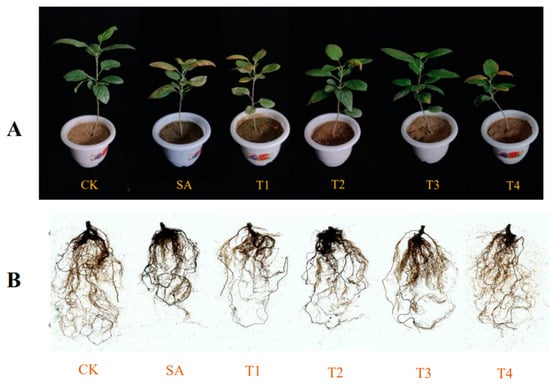 Effect of zinc oxide nanoparticles on leaves and roots of M9-T337 seedlings under saline stress. CK: normal treatment (control); SA: 100 mmol/L NaCl + NaHCO3 saline alkali stress; T1: saline alkali stress +50 mg/L ZnO NPs; T2: saline alkali stress +100 mg/L ZnO NPs; T3: saline alkali stress +150 mg/L ZnO NPs; T4: saline alkali stress +200 mg/L ZnO NPs. (A) Plant phenotype; (B) root phenotype.