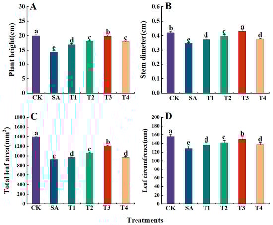 Effects of ZnO NPs on the growth parameters of M9-T337 seedlings under saline alkali stress. CK: normal treatment (control); SA: 100 mmol/L NaCl + NaHCO3 saline alkali stress; T1: saline alkali stress +50 mg/L ZnO NPs; T2: saline alkali stress +100 mg/L ZnO NPs; T3: saline alkali stress +150 mg/L ZnO NPs; T4: saline alkali stress +200 mg/L ZnO NPs. (A) plant height; (B) stem thickness; (C) leaf area; (D) leaf circumference. Vertical bars represent the standard errors of the means of three replicates. Data show the mean ± SE (n = 3). Different lowercase letters indicate significant differences between treatments with p < 0.05.