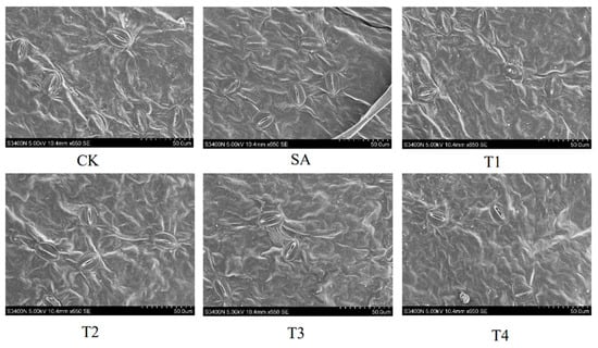 Stomata serve as crucial gateways for carbon and water exchange between plant leaves and the atmosphere. As shown in Figure 4, under the SA treatment, most stomata are in a closed state. However, the closure of pores was found to be alleviated after ZnO NP treatment. The stomatal opening state was the under the T3 treatment (150 mg/L ZnO NPs).