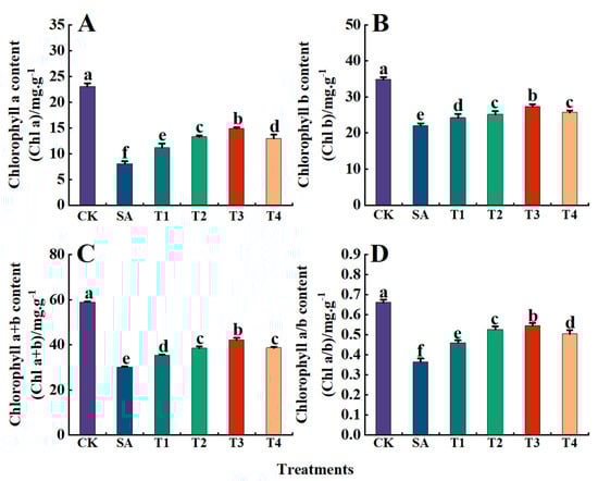 Effect of ZnO NPs on photosynthetic pigment content of M9-T337 seedling leaves under saline stress. CK: normal treatment (control); SA: 100 mmol/L NaCl + NaHCO3 saline alkali stress; T1: saline alkali stress +50 mg/L ZnO NPs; T2: saline alkali stress +100 mg/L ZnO NPs; T3: saline alkali stress +150 mg/L ZnO NPs; T4: saline alkali stress +200 mg/L ZnO NPs. (A) Chl a content; (B) Chl b content; (C) Chl a+b content; (D) Chl a/b content. Vertical bars represent the standard errors of the means of three replicates. Data show the mean ± SE (n = 3). Different lowercase letters indicate significant differences between treatments with p < 0.05.