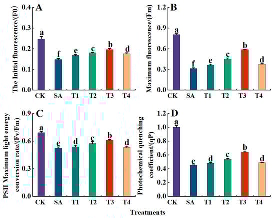 Effect of ZnO NPs on fluorescence parameters of M9-T337 seedling leaves under saline stress. CK: Normal treatment (control); SA: 100 mmol/L NaCl + NaHCO3 saline alkali stress; T1: saline alkali stress +50 mg/L ZnO NPs; T2: saline alkali stress +100 mg/L ZnO NPs; T3: saline alkali stress +150 mg/L ZnO NPs; T4: saline alkali stress +200 mg/L ZnO NPs. (A) F0; (B) Fm; (C) Fv/Fm; (D) qP. Vertical bars represent the standard errors of the means three replicates. Data show the mean ± SE (n = 3). Different lowercase letters indicate significant differences between treatments with p < 0.05.
