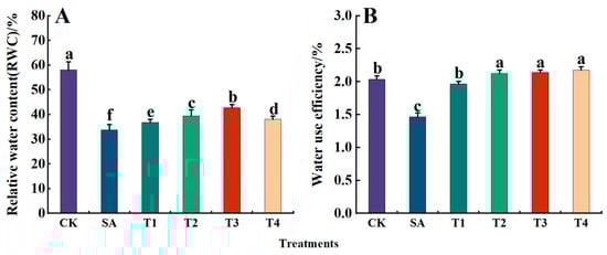 Effects of ZnO NPs on leaf relative water content and water use efficiency of M9-T337 seedlings under saline alkali stress. CK: normal treatment (control); SA: 100 mmol/L NaCl + NaHCO3 saline alkali stress; T1: saline alkali stress +50 mg/L ZnO NPs; T2: saline alkali stress +100 mg/L ZnO NPs; T3: saline alkali stress +150 mg/L ZnO NPs; T4: saline alkali stress +200 mg/L ZnO NPs. (A) RWC; (B) water use efficiency. Vertical bars represent the standard errors of the means of three replicates. Data show the mean ± SE (n = 3). Different lowercase letters indicate significant differences between treatments with p < 0.05.