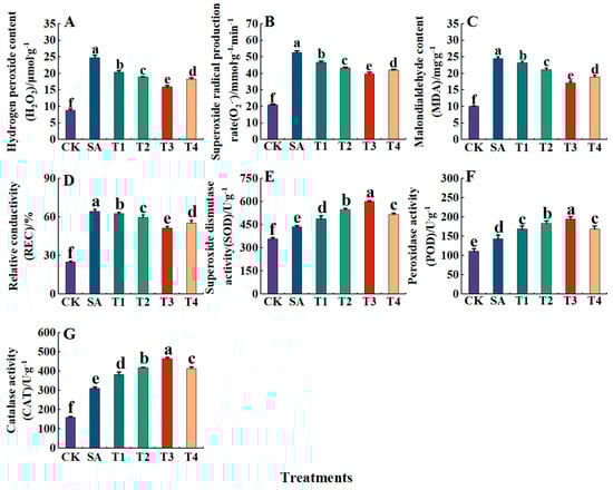 Effect of ZnO NPs on the degree of membrane lipid oxidation in M9-T337 seedlings under saline stress. CK: normal treatment (control); SA: 100 mmol/L NaCl + NaHCO3 saline alkali stress; T1: saline alkali stress +50 mg/L ZnO NPs; T2: saline alkali stress +100 mg/L ZnO NPs; T3: saline alkali stress +150 mg/L ZnO NPs; T4: saline alkali stress +200 mg/L ZnO NPs. (A) H2O2; (B) O2•−; (C) MDA; (D) REC; (E) SOD; (F) POD; (G) CAT. Vertical bars represent the standard errors of the means of three replicates. Data show the mean ± SE (n = 3). Different lowercase letters indicate significant differences between treatments with p < 0.05.