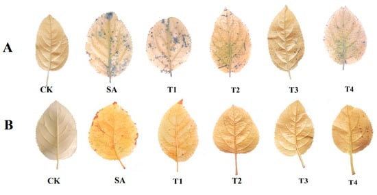 Effect of ZnO NPs on NBT and DAB staining of M9-T337 seedling leaves under salinity stress. CK: normal treatment (control); SA: 100 mmol/L NaCl + NaHCO3 saline alkali stress; T1: saline alkali stress +50 mg/L ZnO NPs; T2: saline alkali stress +100 mg/L ZnO NPs; T3: saline alkali stress +150 mg/L ZnO NPs; T4: saline alkali stress +200 mg/L ZnO NPs. (A) NBT staining; (B) DBA staining.