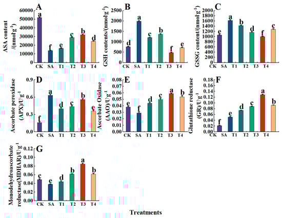 The activities of antioxidant enzymes (SOD, POD, and CAT), ASA-GSH cycle enzymes (APX, AAO, MDHAR, and GR) and the content of ASA-GSH cycle substances (ASA, GSH, and GSSG) were determined using the kits made by Beijing Soleibao Technology Co., Ltd. (Beijing, China). Each treatment was repeated 3 times.