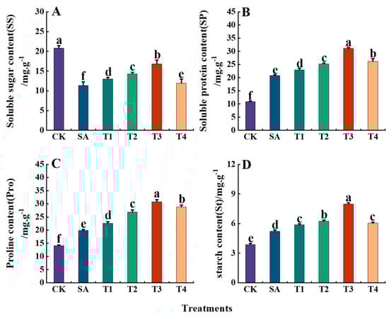 Determination of osmoregulatory substances in leaves of M9-T337 seedlings under saline alkali stress by ZnO NPs. CK: normal treatment (control); SA: 100 mmol/L NaCl + NaHCO3 saline alkali stress; T1: saline alkali stress +50 mg/L ZnO NPs; T2: saline alkali stress +100 mg/L ZnO NPs; T3: saline alkali stress +150 mg/L ZnO NPs; T4: saline alkali stress +200 mg/L ZnO NPs. (A) SS content; (B) SP content; (C) Pro content; (D) St content. Vertical bars represent the standard errors of the means of three replicates. Data show the mean ± SE (n = 3). Different lowercase letters indicate significant differences between treatments with p < 0.05.