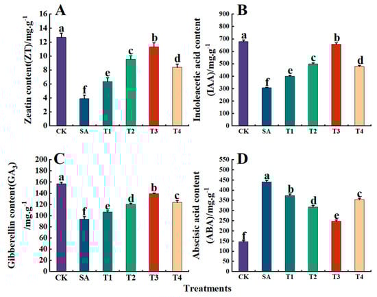 As described by Zheng et al., the contents of IAA, GA3, ZT and ABA in 0.5 g leaves were determined by high performance liquid chromatography–tandem mass spectrometry (UHPLC–MS/MS). The chromatographic conditions were as follows: a Symmetry C18 chromatographic column (5 μm, 4.6 mm × 250 mm column), a mobile phase composed of methanol and 0.1% phosphoric acid at a volume ratio of 1:9, a flow rate of 1 mL/min, a detection wavelength of 254 nm, and a column temperature of 30 °C. The sample injection volume was 10 μL [43].