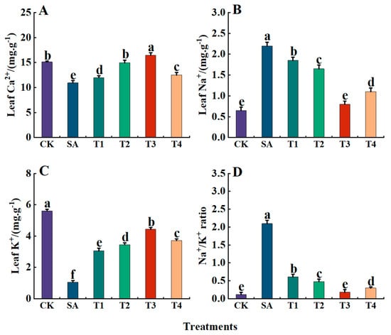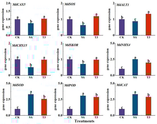 The leaves of M9-T337 seedlings were dried and ground in an oven. Leaf powder samples (5 g) were accurately weighed and digested with H2SO4-H2O2 [47]. The contents of sodium and potassium ions were determined by flame photometer (FP6410, Perkin Elmer, Waltham, MA, USA).