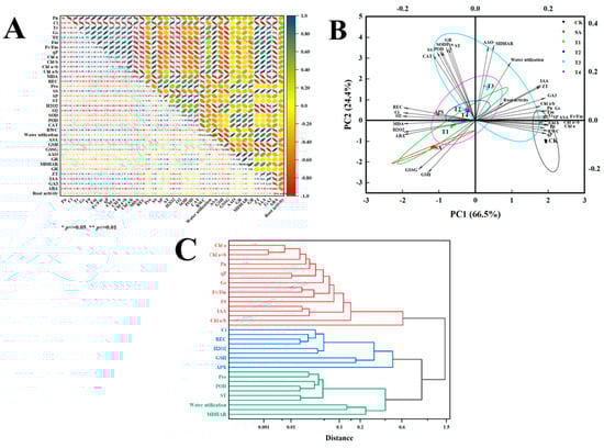 The relative conductivity (REC) was measured by conductivity meter [38]; malondialdehyde (MDA) was determined by thiobarbituric acid (TBA) method [39]; Pro was determined by acid ninhydrin staining method [40]; SS was determined by anthrone method [41]; SP was determined by Coomassie brilliant blue G-250 staining [42].