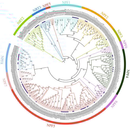 Phylogenetic analysis of NRT proteins from Arabidopsis thaliana, Populus trichocarpa, Ginkgo biloba, and Pinus koraiensis. The NRT proteins were classified into three subfamilies: NPF/NRT1, NRT2, and NRT3. NPF/NRT1 can be further classified into eight subfamilies (NPF1–NPF8). The dark blue dots indicate the PkNRT proteins.