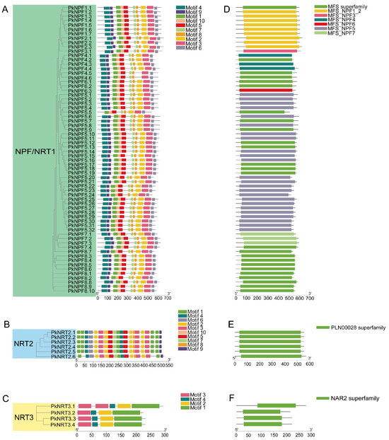 The motif, gene structure, and conserved domains of PkNRTs. (A–C) The motif analysis of NRT1/NPF, NRT2, and NRT3 proteins. (D–F) The conserved domains of PkNRTs. All detailed information of identified conserved motif sequences is provided in Table S1. Gene structure detailed information is provided in Table S2. A scale bar is provided at the bottom.