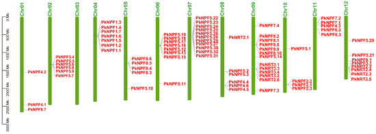 Chromosomal location of PkNRTs. The chromosome numbers are shown above. The unit of scale is in megabases (Mb).
