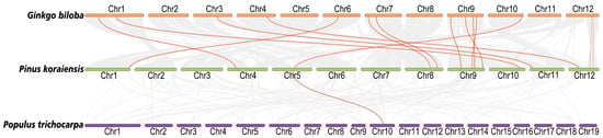 Collinearity analysis of NRTs between Ginkgo biloba and P. koraiensis and P. trichocarpa. The gray lines represent the collinearity between P. koraiensis and other two species. Collinear gene pairs in the NRT gene family are marked with red lines.