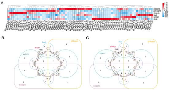 Transcriptome-based expression profiling of PkNRTs. (A) Expression of PkNRTs from six Korean pine tissues including root, shoot, bud, xylem, phloem, and needle. (B) The Venn diagram of the top 12 most highly expressed PkNRTs involved in each tissue. (C) The Venn diagram of PkNRTs with the lowest expression levels (FPKM < 0.5) between different tissues.