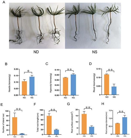 Effect of nitrogen treatment on the growth of Korean pine seedlings. (A) Phenotype of seedlings treated with or without nitrogen for 12 weeks. (B–D) Biomass of needle, hypocotyl, and root under ND and NS conditions. (E) Number of lateral roots. (F) Total root length of seedlings. (G) Root surface area. (H) Root mean diameter. Bars show means of three biological replicates ± standard error. Asterisk indicates significant difference between nitrogen treatment using Student’s t-test (* p < 0.05; ** p < 0.01).