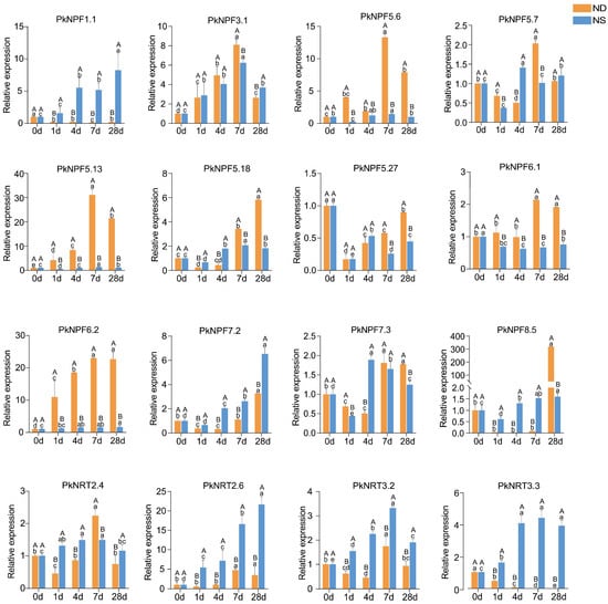 Relative expression of 16 selected PkNRTs under different nitrogen conditions. The expression levels of selected PkNRTs in roots of Korean pine seedlings after 1 d, 4 d, 7 d, and 28 d under NS and ND treatment was calculated by qRT-PCR, with PkActin as the reference gene. Capital letters indicate significant differences in expression levels between the two different treatments (ND and NS) at the same time (p < 0.05), while lowercase letters denote significant differences in expression levels at different times (0 d, 1 d, 4 d, 7 d, and 28 d) under the same treatments (p < 0.05). Bars show the means of three biological replicates ± standard error.