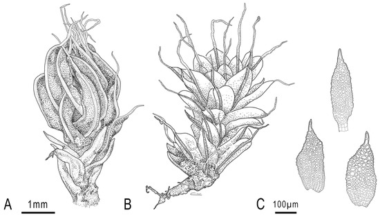S. laevipila, (A)—Habit of dry plant, (B)—Habit of wet plant, (C)—Specialized asexual propagule. The drawing was made by the authors.