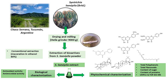 S. laevipila collected in Chaco Serrano, Tucumán, Argentina, was used in this study. The dry plant material was ground to obtain a fine powder, and an ethanolic extract was prepared by maceration and chemically characterized and standardized, and its functional properties were determined (Figure 2).