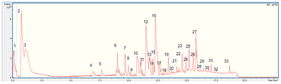 Flavonoids: Several flavonoids were identified, some of them co-spiking with authentic standards: cirsimaritin, apigenin, and chrysoeriol, peaks 27, 29, and 31, (C17H13O6, C15H10O5, and C16H12O6), respectively. These compounds are known to have a variety of therapeutic properties, including antioxidant, anticancer, antiviral, anti-inflammatory, antimutagenic, and antibacterial effects [35,36,37].