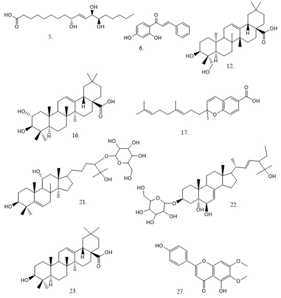 Structures of some representative compounds detected in S. laevipila: peak 5, pinellic acid; peak 6, 2’,4’-Dihydroxychalcone; peak 12, hederagenin; peak 16, maslinic acid; peak 17, piperochromenoic acid; peak 21, mogroside I-A1; peak 22, recurvoside A; peak 23, oleanolic acid; and peak 27, cirsimaritin.