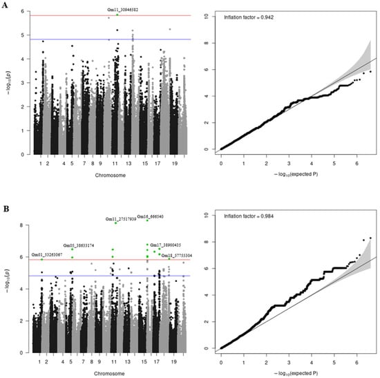 Manhattan and QQ plots for protein (A) and oil (B) content GWAS results for the pooled traits combining phenotypes from the Novosibirsk and Orel regions. The plots represent the −log10 transformed p-values. The red line indicates the significance level at p = 1.5 × 10−6. The blue line indicates the significance level at p = 1.5 × 10−5. Significant SNPs are shown in green. The top significant SNP per chromosome is annotated.