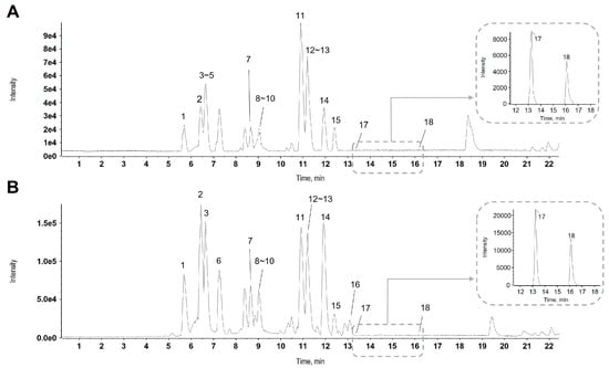 The representative base peak chromatogram (BPC) of the ethanol extract of Caesalpinia sappan L. (CSE) was obtained using LC-ESI-QTOF MS/MS analysis in positive (A) and negative (B) ion modes. 1: 3′-O-methylcatechin, 2: brazilin, 3: protosappanin B, 4: chrysophanol, 5: dihydroxyxanthone, 6: 4′-O-methylcatechin, 7: lyoniresinol, 8: 3′-O-methylbrazilin, 9: brazilein, 10: sappanone B, 11: sappanchalcone, 12: 5,7,4′-tri-O-methylcatechin, 13: sappanone A, 14: 5,7,3′-tri-O-methyl (-)-epicatechin, 15: brazilane, 16: 10,11-dihydroxydracaenone C, 17: 4′-O-methylbrazilin, and 18: tricin. The extracted ion chromatograms of compounds 17 and 18 are shown above each BPC.