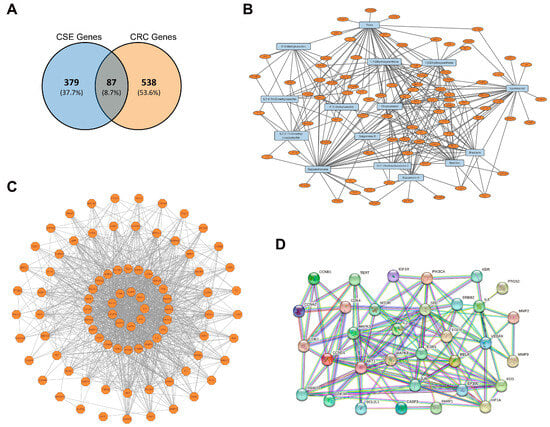 Network pharmacological analysis of C. sappan L. (A) Venn diagram for 466 target genes of CSE and 625 CRC-related genes. Eighty-seven genes were common. (B) Network of compounds and target genes of CSE. Each node represents either a compound or a target gene, and the edges represent interactions between these compounds and genes. (C) Protein–protein interaction (PPI) of the common 87 target genes. The 33 genes in the inner circle have more or stronger connections with other genes. (D) STRING analysis of the PPI network of selected 33 target genes.