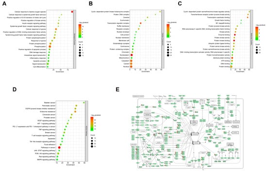 Pathway enrichment analysis for the 33 target genes of C. sappan L. (A) The Gene Ontology (GO) biological process (BP) gene sets, (B) GO cellular component (CC) gene sets, (C) GO molecular function (MF) gene sets, and (D) the Kyoto Encyclopedia of Genes and Genomes (KEGG) gene sets. (E) Pathways in cancer involved in cell cycle regulation, apoptosis, and signal transduction.