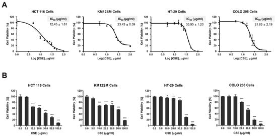 Inhibitory effect of CSE on the cell proliferation of human CRC cell lines. (A) The determination of ATP levels in HCT 116, KM12SM, HT-29, and COLO 205 cells. Cells were treated with CSE (0–100 μg/mL) for 48 h. ATP levels were assessed using CellTiter-Glo 2.0. The dose–response curves and half-maximal inhibitory concentration (IC50) values are determined. (B) The effect of CSE on cell proliferation of CRC cells. Cells were treated with CSE (0–100 μg/mL) for 48 h. Cell viability was assessed through a Cell Counting Kit-8 assay (CCK-8). * p < 0.05, ** p < 0.01, and *** p < 0.001, compared to the control (0 μg/mL) group.