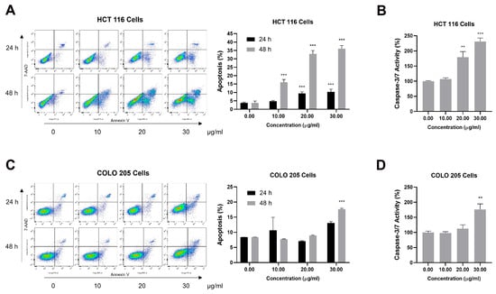 Annexin V/7-AAD double staining was performed to detect apoptosis in HCT 116 and COLO 205. The cells were treated with concentrations of 0, 10, 20, and 30 μg/mL for 24 h and 48 h. After the exposure, a significant increase in early and late apoptosis was observed in both cells. We also found that the percentage of apoptosis increased in a dose- and time-dependent manner in both HCT 116 and COLO 205 cells (Figure 5A,C). To further confirm the apoptotic process induced by CSE, caspase-3/7 activity was measured using the Caspase-Glo 3/7 Assay Kit. After 48 h of treatment, the percentage of apoptosis at 10 μg/mL of CSE was comparable. However, 30 μg/mL of CSE treatment indicated significantly elevated activity in HCT 116 and COLO 205 (Figure 5B,D). These results suggest that CSE could promote caspase-dependent apoptosis in CRC cells.
