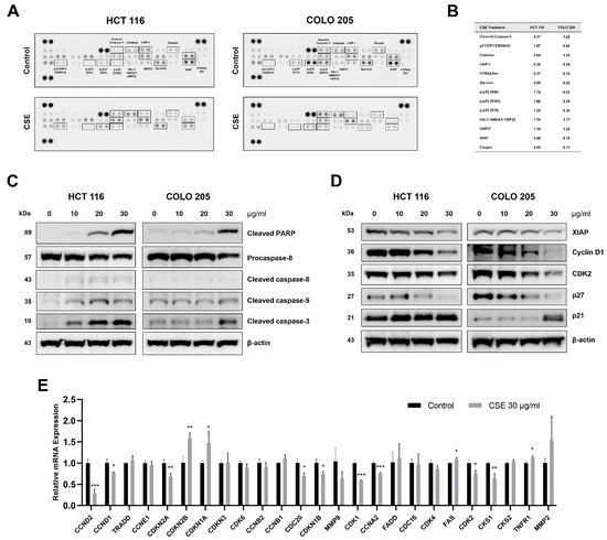 Effect of CSE on apoptosis and cell cycle regulatory proteins in HCT 116 and COLO 205 cells. (A) Images of protein array showing the expression of apoptosis-related proteins in control and CSE-treated HCT 116 and COLO 205 cells. Cells were treated with 30 μg/mL CSE for 48 h. (B) Quantitative comparison of selected protein levels, shown as average fold-difference relative to control (0 μg/mL), based on duplicates from the protein array. (C) The expression levels of apoptotic proteins, including PARP, caspase-8, caspase-9, and caspase-3. (D) The expression levels of cell cycle regulatory proteins, including XIAP, cyclin D1, CDK2, p27, and p21. (E) Relative mRNA expression of cell-cycle-related genes in control and CSE-treated HCT 116 cells. Bars represent the mean ± SD (n = 3). * p < 0.05, ** p < 0.01, and *** p < 0.001, compared to the control group.