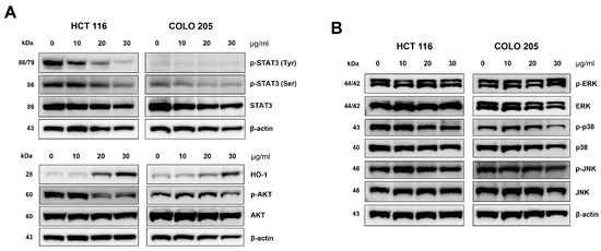 Effect of CSE on STAT3, AKT, and mitogen-activated protein kinase (MAPK) pathways in HCT 116 and COLO 205 cells. (A) Protein expression of STAT3 and AKT pathways. (B) Protein expression of MAPK pathways, such as ERK, p38, and JNK.