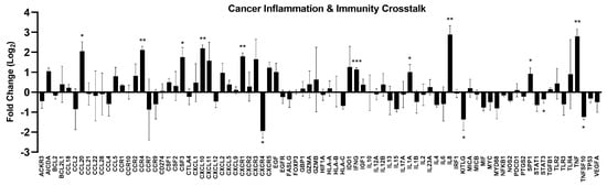 Fold change in gene expression related to cancer inflammation and immunity crosstalk in CSE-treated HCT 116 cells. Cells were treated with CSE (30 μg/mL) for 24 h. Fold change (Log2) in expression levels of genes following CSE treatment was calculated relative to control (0 μg/mL) cells. Bars represent the mean ± SD of three independent experiments. * p < 0.05, ** p < 0.01, and *** p < 0.001, compared to the control group.