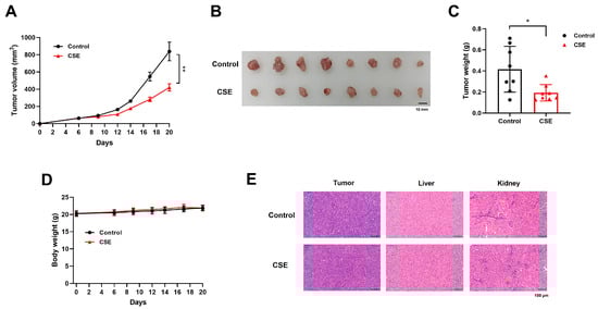 CSE suppressed the tumor growth of the MC38 colorectal tumor. MC38 cells (1 × 105 cells) were inoculated subcutaneously into the right flank of C57BL/6 female mice. Mice were divided into the control and CSE-treated groups (n = 8, each group). One week after injection, CSE was administered daily at a dose of 100 mg/kg via oral gavage, with 1% CMC in DW used as a control. (A) Tumor volumes were measured every 3 days after the treatment. (B) Tumor images from mice. Scale bar represents 10 mm. (C) Tumor weights were shown. (D) Body weight changes of MC38-bearing mice. (E) Hematoxylin and eosin staining of tumor, liver, and kidney. Scale bar 100 µm. * p < 0.05 and ** p < 0.01, compared to the control group.