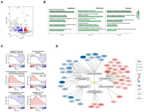 Transcriptomic effects of CSE treatment. (A) Volcano plot depicting differentially expressed genes (DEGs) between CSE-treated and control groups. Red points indicate significantly upregulated genes, while blue points represent significantly downregulated genes (|log2 fold change (FC)| > 1.2, p-value < 0.05). (B) EnrichR analysis showing significantly enriched cellular processes. Key processes include apoptosis, cell cycle regulation, and immune response, based on the DEGs from the CSE treatment group. (C) Gene Set Enrichment Analysis (GSEA) plots demonstrating the impact of CSE on specific pathways. Cell cycle checkpoint signaling is significantly influenced, with both upregulation and downregulation observed across the ranked gene list. T-cell signaling pathways, including co-stimulation and regulation of apoptosis, are notably enriched. Pathways related to immune responses, such as interferon-mediated signaling and inflammasome assembly, show significant enrichment. (D) Drug–pathway–gene interaction network reconstructed using the GSEA results. The network highlights the interactions between CSE-regulated genes (circles), key pathways (squares), and drugs (hexagons). Node colors represent the log2 fold change in gene expression, with connections indicating regulatory relationships: arrows signify positive regulation, T-shaped ends indicate negative regulation, and lines represent associations. Only genes with |FC| > 1.2 are included, aligned with the regulatory patterns of the pathways.
