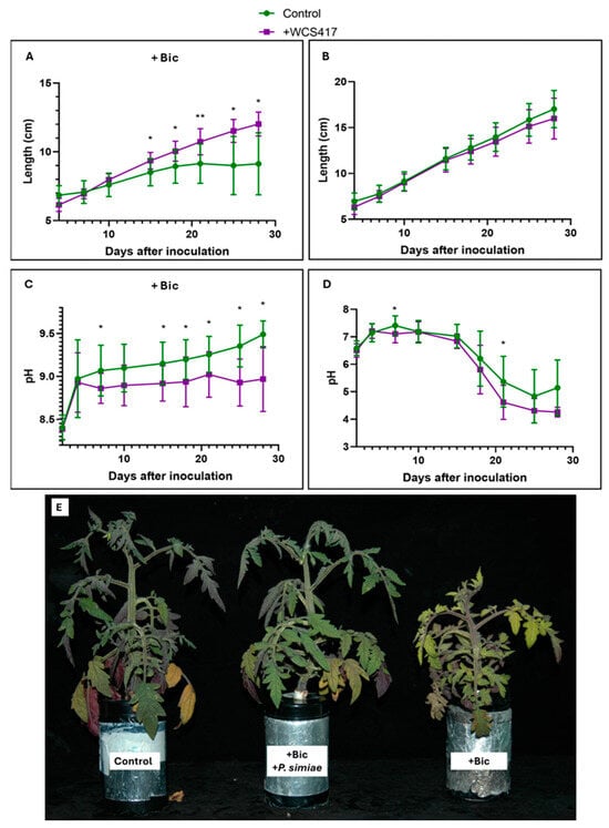 Effect of inoculation with the WCS417 strain on the growth and acidification of tomato plants grown in a hydroponic system. Once the nutrient solution was inoculated with 107 CFU mL−1 bacterial suspension of the WCS417 strain, seedlings were transferred to individual containers. Shoot growth and the pH of the nutrient solution were monitored over time. (A) Growth evolution of tomato plants over 28 days cultured in the presence of 40 mM NaHCO3. (B) Growth evolution of tomato plants over 28 days cultured in the absence of NaHCO3. (C) pH evolution in the nutrient solution over 28 days of tomato plants grown in the presence of 40 mM NaHCO3. (D) pH evolution in the nutrient solution over 28 days of tomato plants grown in the absence of NaHCO3. (E) Comparison between control, inoculated treatments with P. simiae in the presence of NaHCO3, and non-inoculated treatments of tomato plants grown in the presence of NaHCO3 and after 37 days. * p < 0.05 and ** p < 0.01 indicate significant differences between inoculated and control treatments. Values are the means ± S.E. of 12 replicates.